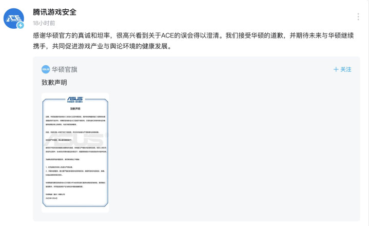 随后,腾讯游戏安全转发了该声明时表示:“感谢华硕官方的真诚和坦率,很高兴看到关于ACE的误会得以澄清。我们接受华硕的道歉,并期待未来与华硕继续携手,共同促进游戏产业与舆论环境的健康发展。”