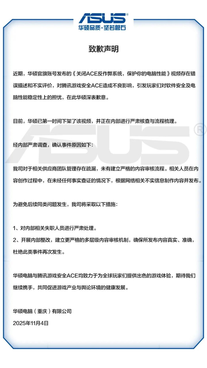 11月5日凌晨,华硕电脑(重庆)有限公司发布致歉声明,近期,华硕官旗账号发布的《关闭ACE反作弊系统,保护你的电脑性能》视频存在错误描述和不实评价,对腾讯游戏安全ACE造成不良影响,引发玩家们对软件安全及电脑性能稳定性上的担忧,在此华硕深表歉意。