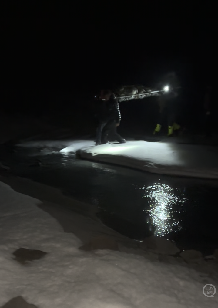 救援队摸黑蹚过雪水。受访者供图