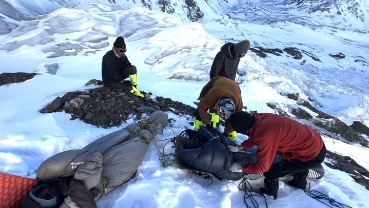 朱先生告诉记者,事后他发现摔落点距离他们的帐篷只有约一公里路程,但就是这一公里的路,他爬了10个小时,途中数次绝望,“过最后一个雪坑的时候,准备把自己埋了。”就在这时,他隐隐约约看到帐篷,凭借这最后的一丝毅力,成功回到了帐篷内,此时已经是8日7点左右。8点过,他拼接好摔成两半的对讲机,联系上了救援队,强调不管是死是活一定要把搭档带出来。“此时对讲机中传来搭档的一声‘我爬出冰裂缝了’,顿时我热泪盈眶,搭档还活着!”