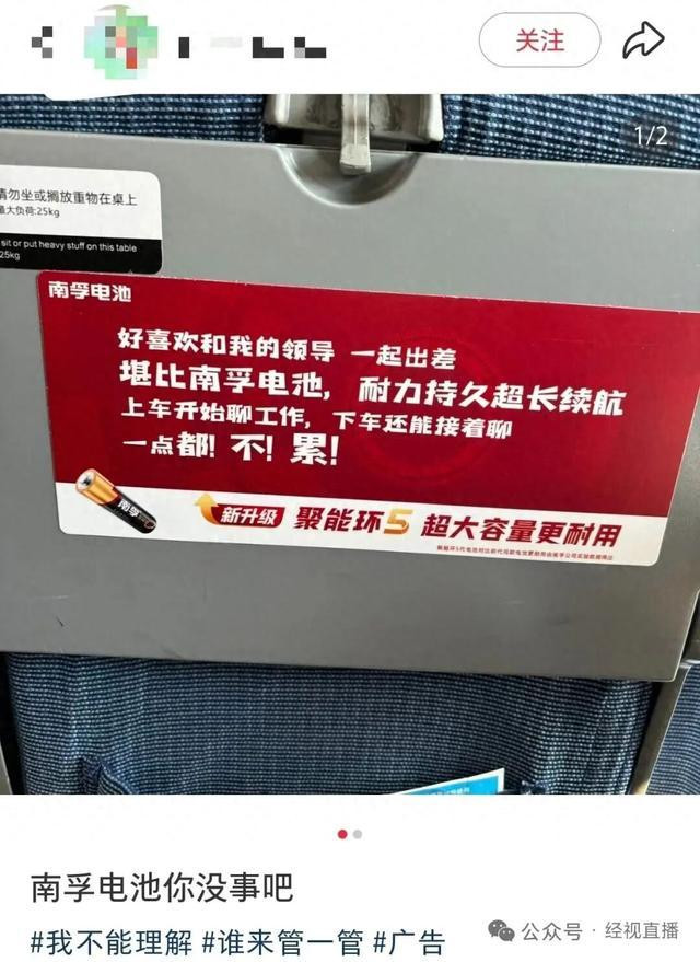 近日,一则出现在高铁座椅背后小桌板上的南孚电池广告语引发关注中国配资论坛,内容为:“好喜欢和我的领导一起出差,堪比南孚电池,耐力持久超长续航,上车开始聊工作,下车还能接着聊,一点都!不!累!”