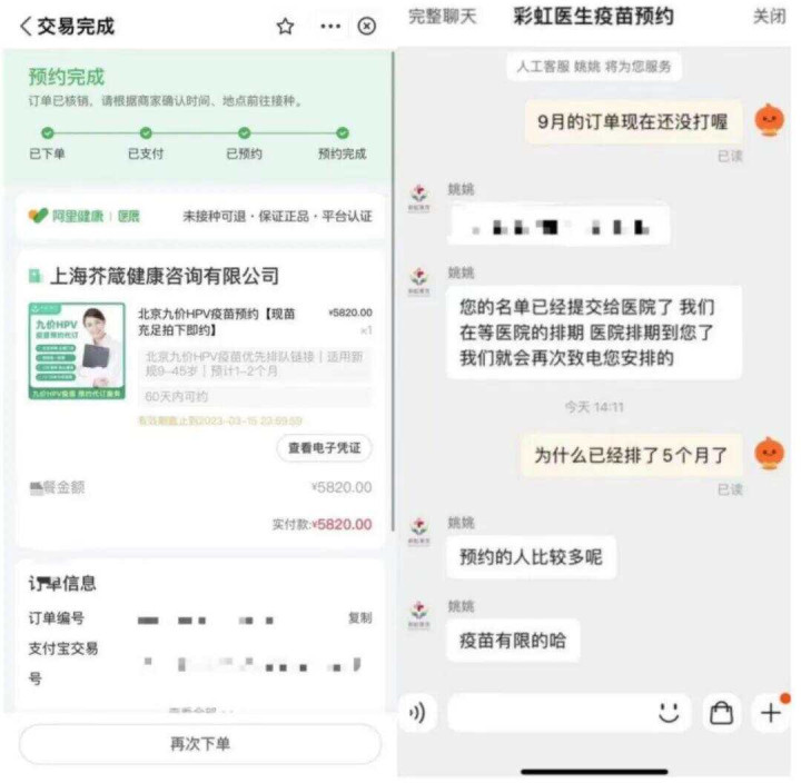 “现苗充足拍下即约”“预计1-2个月(接种)”等“彩虹医生”平台的宣传语让程程(化名)动心了。2022年9月,程程以5820元的价格购买了九价HPV疫苗代预约服务,“预约人数过多,疫苗数量有限”是客服给出的唯一解释。代预约服务盛行及乱象背后,是疫苗稀缺导致的社区卫生服务中心预约难,私立医院预约贵等问题,它正在困扰着想接种HPV疫苗的人群。